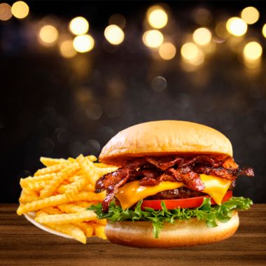 Pão, hambúrguer artesanal 190g, queijo provolone, alface, cebola caramelizada, bacon, fritas e molho da casa.