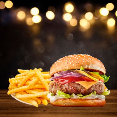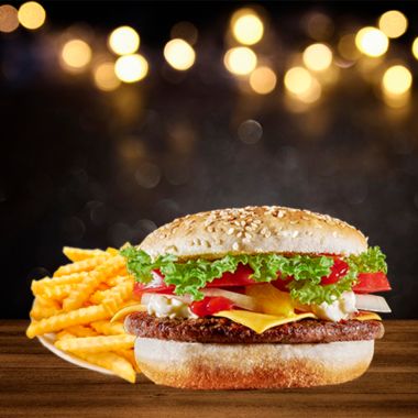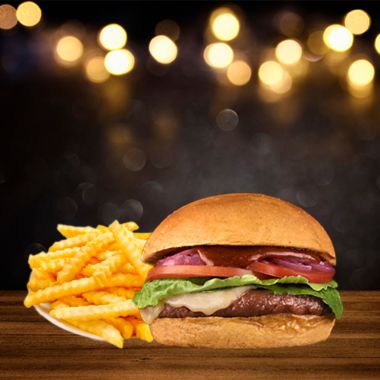 Pão, hambúrguer artesanal 190g, queijo-prato, alface, tomate, fritas e molho da casa.