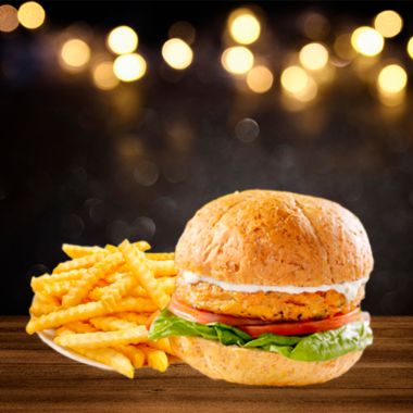 Pão integral, hambúrguer artesanal de feijão branco 120g, mix de folhas verdes, tomate cereja, fritas e molho da casa.