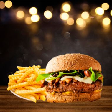 Pão, hambúrguer artesanal de costela 190g, queijo provolone, rúcula, bacon caramelizado, fritas e molho da casa.